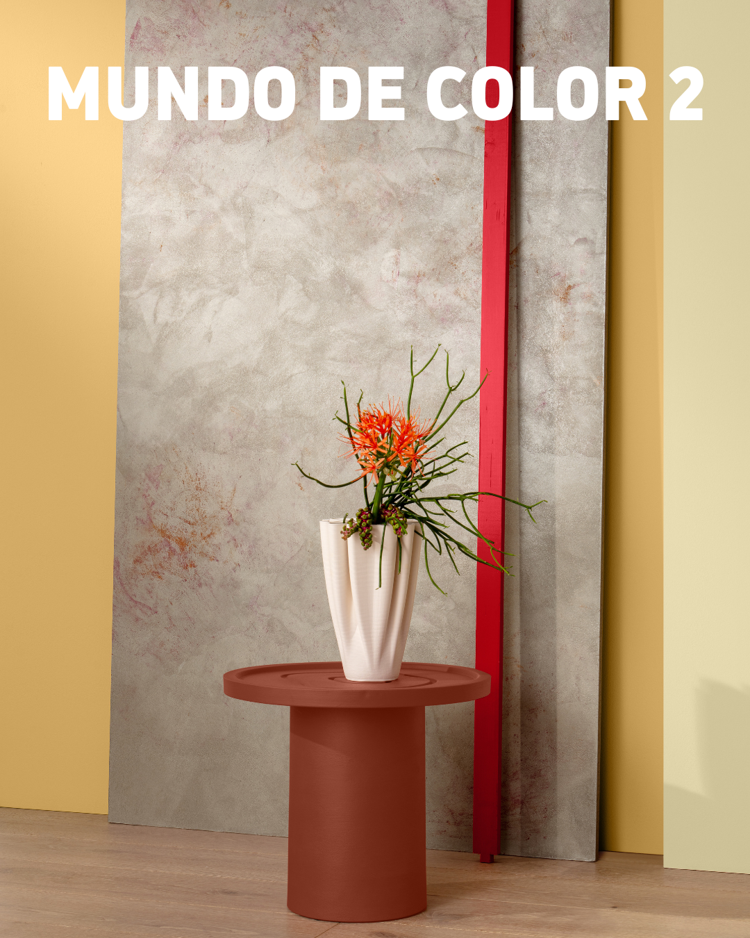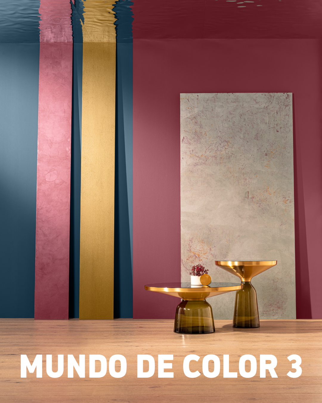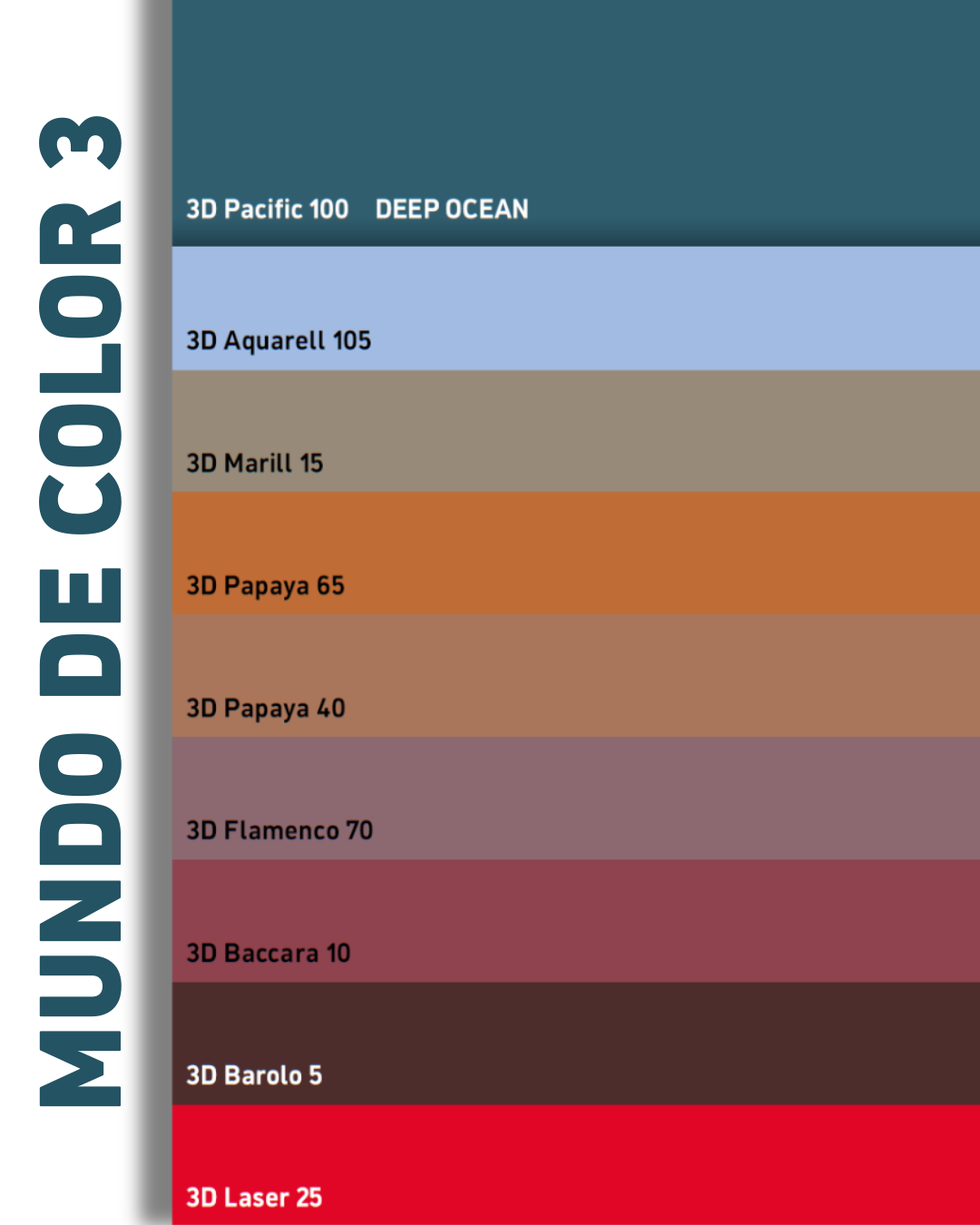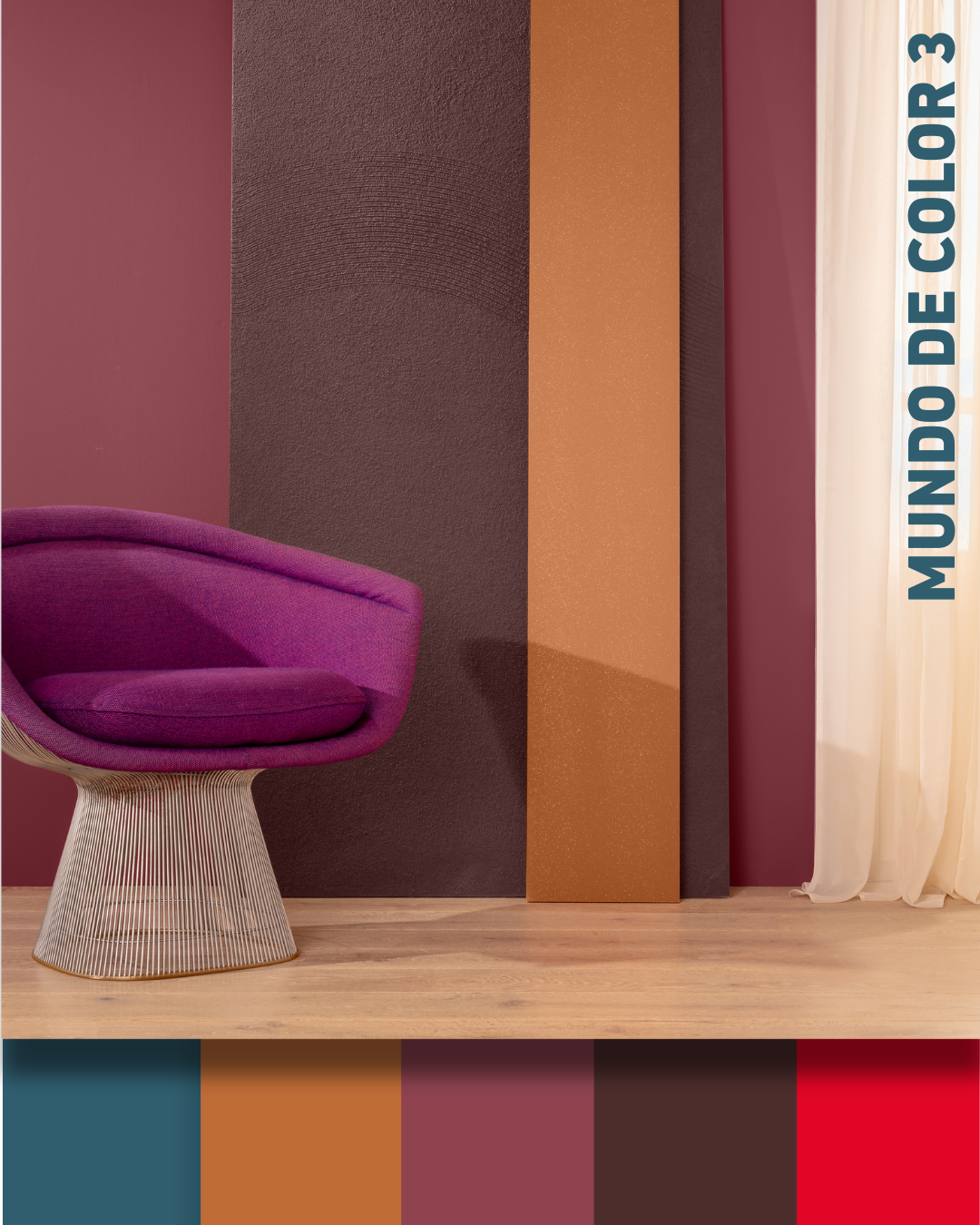 El Mundo de Color 3 sigue un estilo totalmente diferente. Se centra en tonos oscuros e intensos de la gama de los rojos, desde un rojo anaranjado discreto hasta un rojo burdeos intenso y electrizante. El tono Laser 25, con su aspecto brillante y puro, complementa la intensa gama del Mundo de color 3, en la que el color del año vuelve a aparecer como nota complementaria.