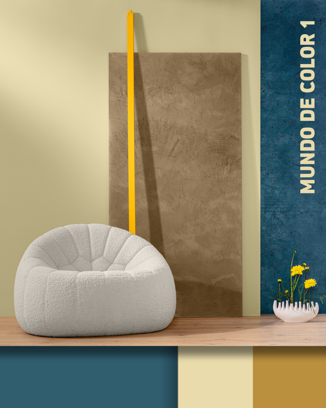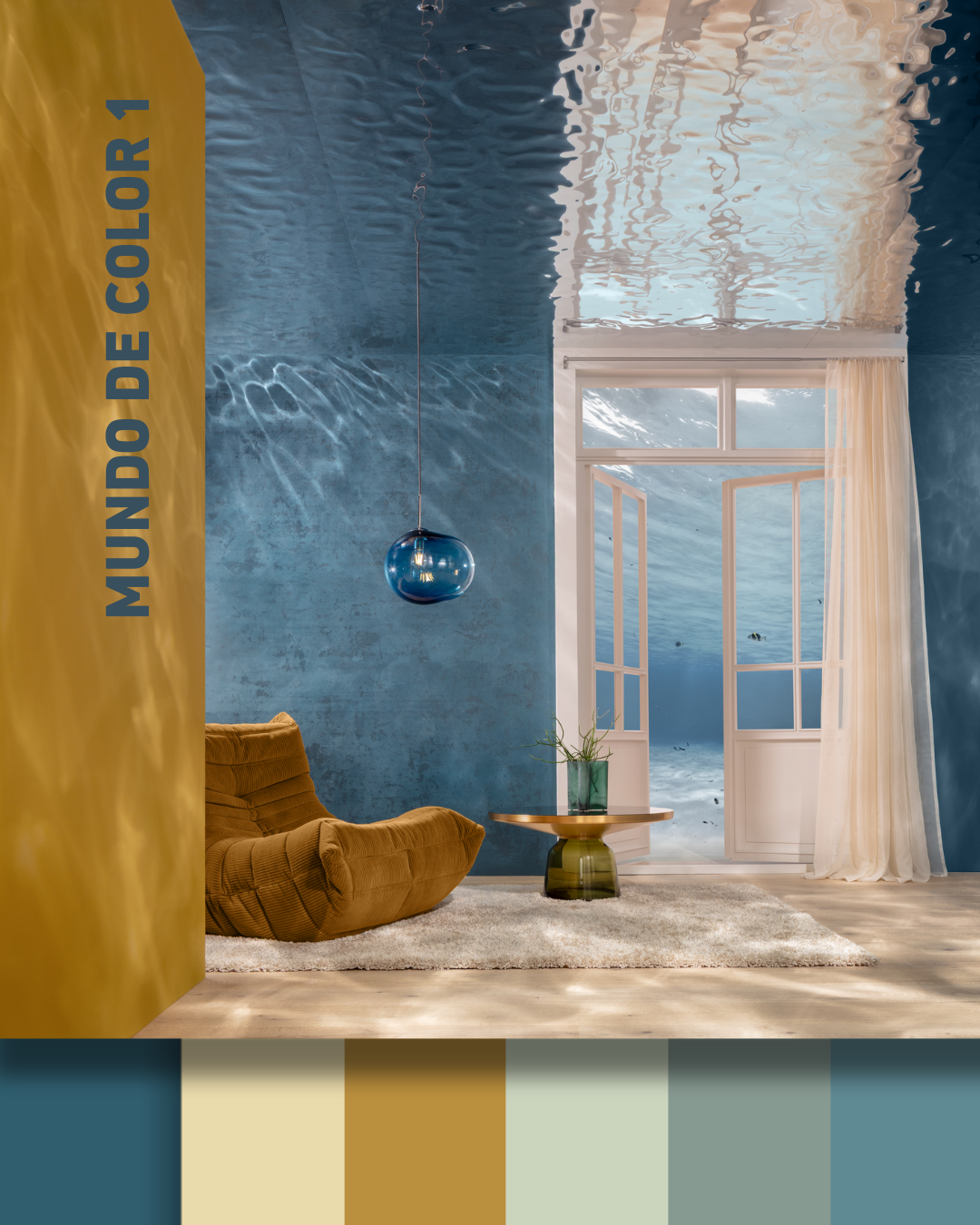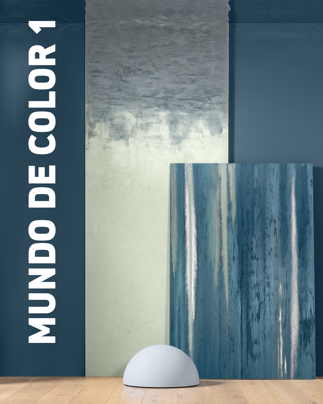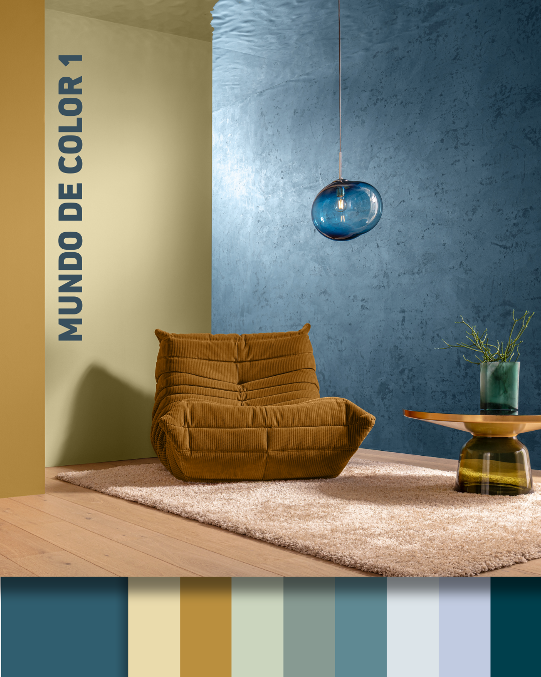 El Mundo de Color 1 evoca el agua en movimiento, como un nexo entre la superficie del agua, el cielo y la tierra. Los matices concisos que van del verde al azul contrastan con el cálido y terroso Palazzo 250 y el velado tono amarillo Citrus 55. El resultado es un espectro vivo y potente, realzado por el tono azul claro y etéreo Saphir 115.